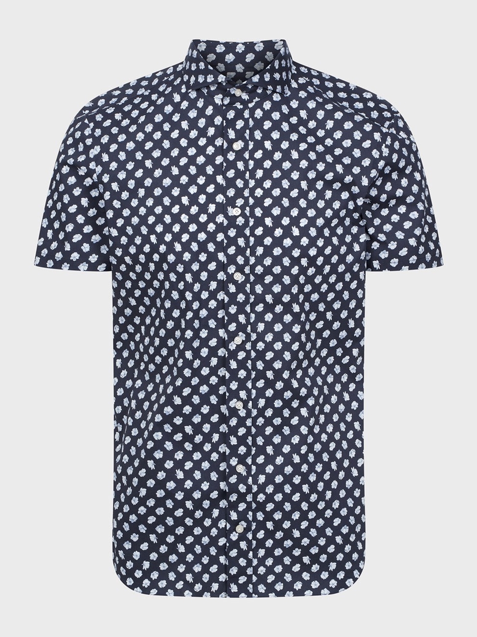 → Navy Printed Poplin Stretch Short Sleeve Sport Casual Shirt