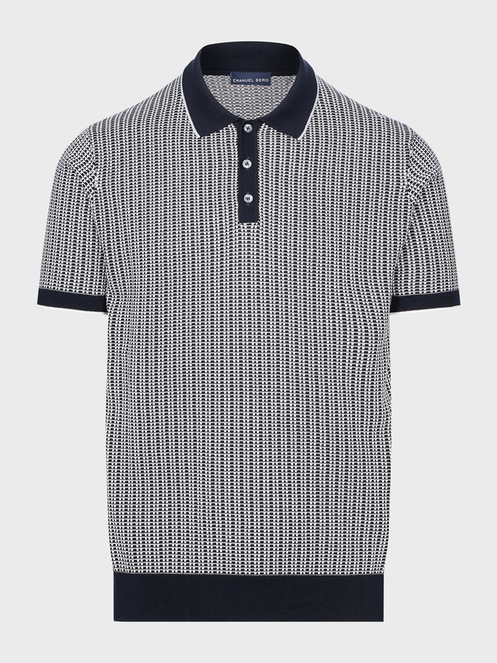 Navy Three Button Short Sleeve Men's Jacquard Polo